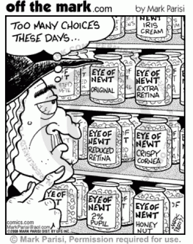 Witch at Grocery Store Witch selecting from too many eye of newt options at grocery store.