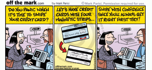 Four magnetic strips on credit cards make customers confident they are swiping in right direction.