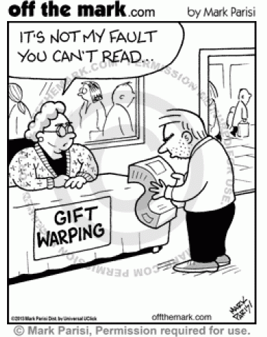 A man gets his gift warped instead of wrapped because he misreads a sign.