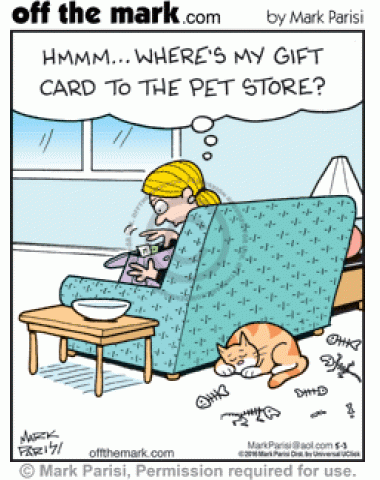 Missing Pet Store Gift Card Woman doesn't realize that pet store gift card is missing because cat used it to buy fish.