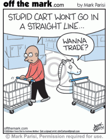 Chess Knight Trades For Crooked Grocery Cart Annoyed supermarket customer complains cart wont roll in straight line & chessboard horse asks to trade.