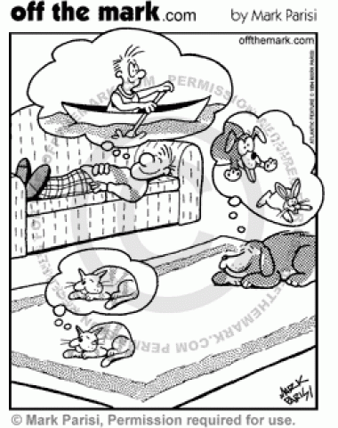 Pet Dreams A man dreams of canoeing, a dog dreams of chasing rabbits, and a cat dreams of sleeping.