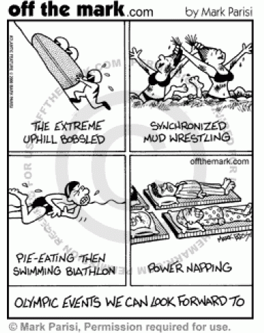 New Olympic Events New Olympic events include power napping and extreme uphill bobsled.