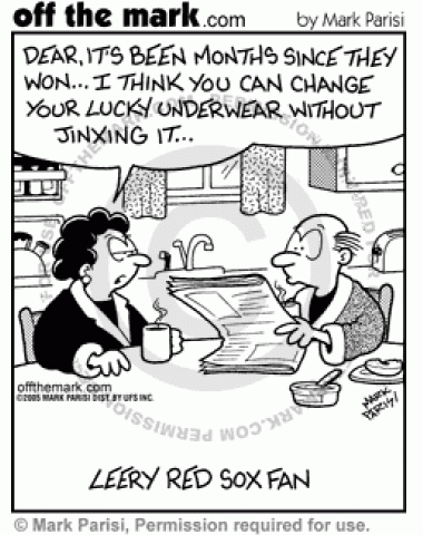 Not Jinxing the Red Sox World Series Win After 2004 World Series Win, a Red Sox fan doesn't want to jinx win by changing underwear.
