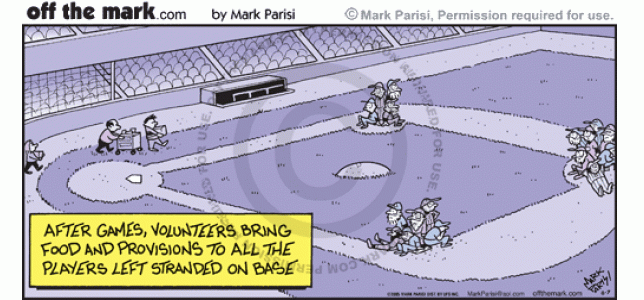 Food Stranded Baseball Volunteers bring food to baseball players stranded on the bases.