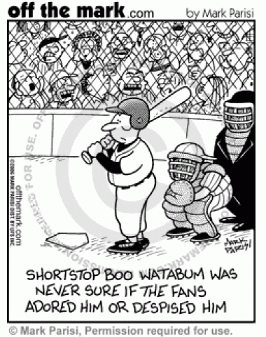 Baseball Cheers and Jeers Baseball player, Boo Watabum can't tell if the fans are cheering or jeering him because of his name.