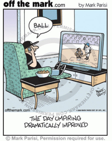 Umpire improves his accuracy by watching games on tv and phoning in his calls.