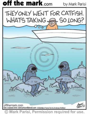 Man waiting in boat worries catfish fishing scuba divers stuck at bottom with cat napping fish on laps have been under water for a long time.