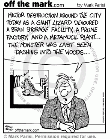 Godzilla Diarrhea Godzilla eats too much fiber and has to retreat to the woods to poop.