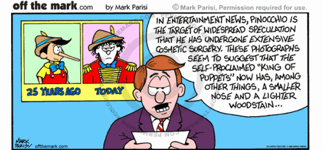 Pinocchio Cosmetic Surgery A news anchor reports that Pinocchio's nose is smaller and his skin is lighter because he's had plastic surgery.
