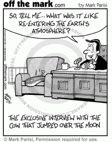 The cow that jumped over the moon is now a steak after reentering the Earth's atmosphere.