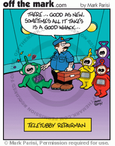 Teletubby Repairman The teletubby repairman fixes them by whacking them.