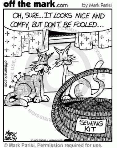 Cat Sewing Kit A cat tries to sleep in a sewing basket, but gets poked by pins.