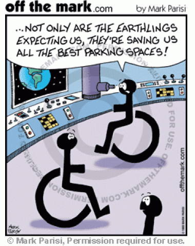 Aliens shaped like the handicap symbol think Earthlings are saving them the best parking spaces.