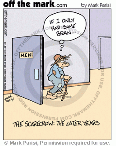 Scarecrow Gets Old Exiting the men's room, the scarecrow wishes he had some bran.