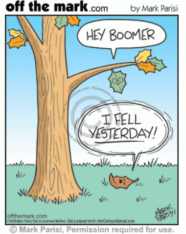 Irritated autumn leaf says I fell yesterday when younger leaf on tree branch calls it old boomers insult.
