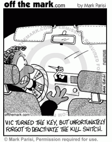 Car Kill Switch A man forgets to deactivate the kill switch in his car, so it tries to stab him.