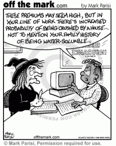 Witch Insurance The Wicked Witch of the West has high insurance premiums because her chances of being crushed by a house or melted in water are so high.