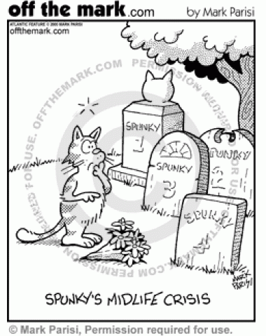 Cat Midlife Crisis A cat has a midlife crisis after losing 4 of his 9 lives.