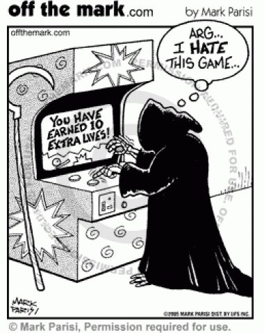 Grim Reaper Plays Video Game The Grim Reaper plays a video game where he gets extra lives.
