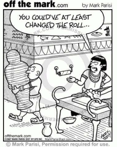 A mummy maker uses up the roll of bandages without putting on a new one.