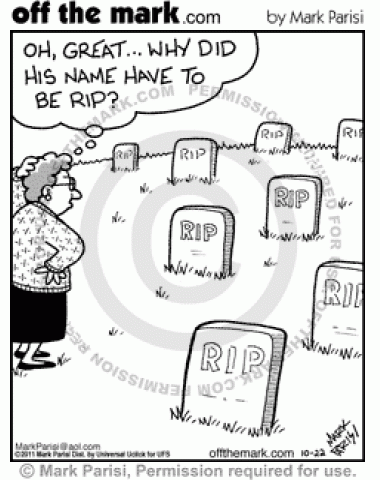 Rip's Headstone Wife can't find her husband Rip's headstone among all the RIPs.