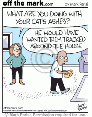 Lady asks why man is sprinkling cremated pet’s remains on floor & owner answers tracking around house what kitty wanted.