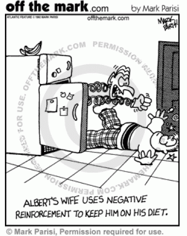 Dieting Negative Reinforcement Albert's wife uses negative reinforcement to help him diet, Albert's laying on floor in front of fridge, scary face and fist popped out at him.