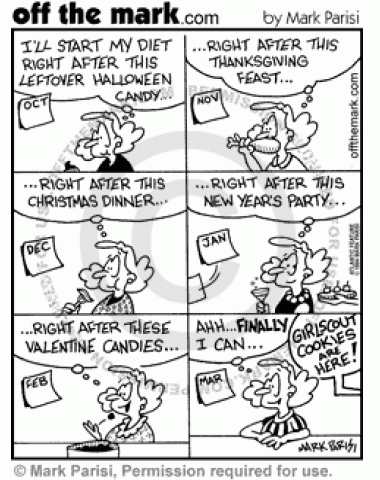 Holiday Dieting A woman keeps pushing her diet back until after the holidays, but once the holidays end her Girl Scout cookies arrive.