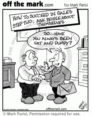 Sales Faux Pas Salespeople are supposed to ask their clients about themselves, so a man asks if his client has always been fat and dumpy.