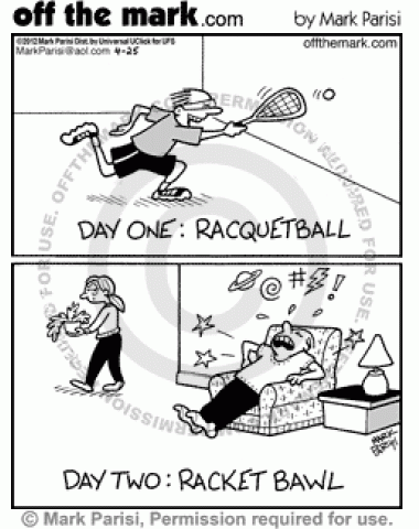 Racket Bawl After racquetball, a man has a racket bawl because exercising made him sore.