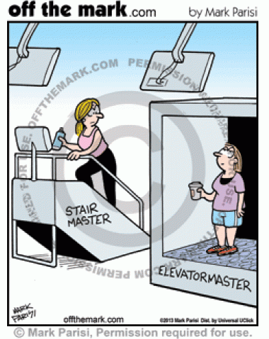 Lazy people at the gym use the elevatormaster instead of the stairmaster.