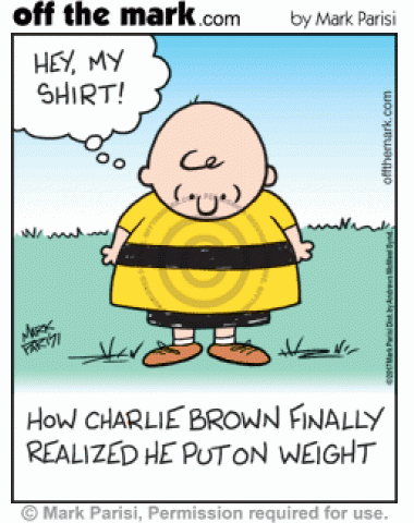 Charlie Brown only realizes he's put on weight when the zig zag on his shirt becomes a straight line.