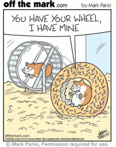 Overweight hamster eating doughnut tells healthy exercising hamster they each like own wheels.