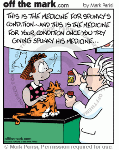 Cat Medicine A vet gives a woman medicine for her cat's condition and medicine for herself once she tries to give the cat its medicine.