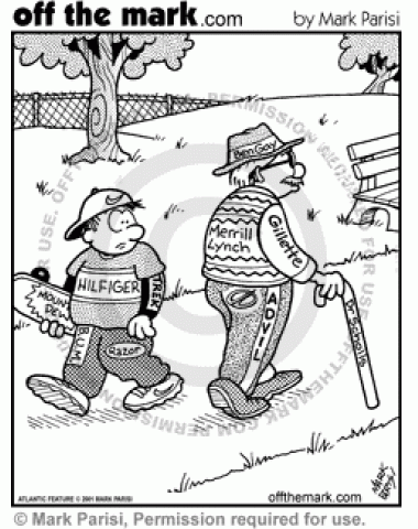 Clothes Endorsement A boy and an old man both wear clothes with endorsements on them.