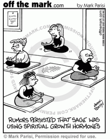 Meditation class believes that member is using spiritual growth hormones to rise above the rest of the class.