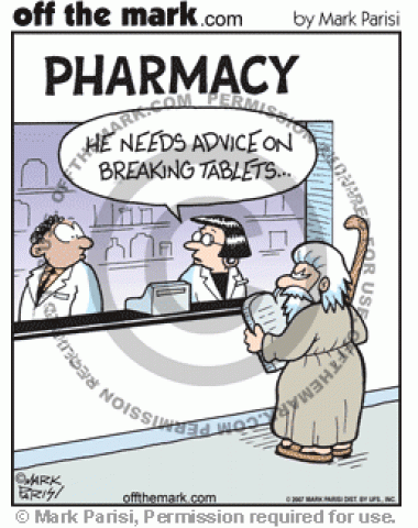 Moses Breaking Tablets Moses goes to a pharmacy to get advice on breaking stone tablets.