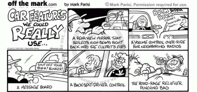 Useful Car Features The cartoon lists car features that would be really helpful.