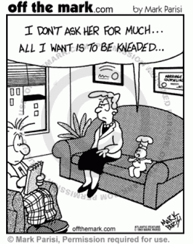 Doughboy Kneaded A doughboy goes to couples therapy because he wants to be kneaded.