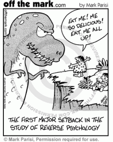 A caveman tries to use reverse psychology, but a dinosaur eats him.