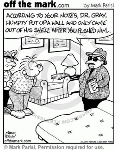The police arrest a psychiatrist for pushing Humpty Dumpty from his wall.