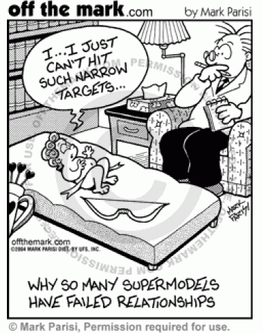 Cupid Sees Psychiatrist Cupid sees a psychiatrist because he keeps missing his targets, supermodels.