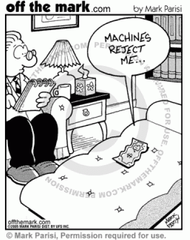 A dollar bill sees a psychiatrist because it is rejected by machines.