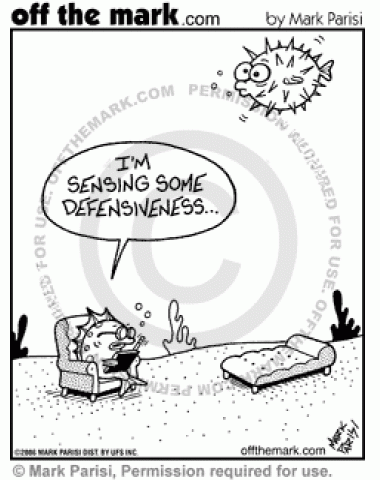 Blowfish Defensive Psychology A blowfish attending a session in psychology is accused of being defensive.
