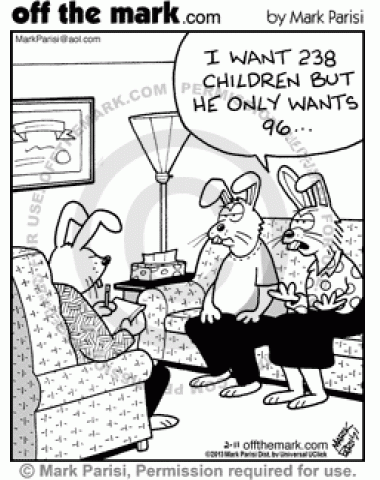 Rabbits Want Babies Rabbits go to couples therapy because one of them wants 96 children and the other wants 238.