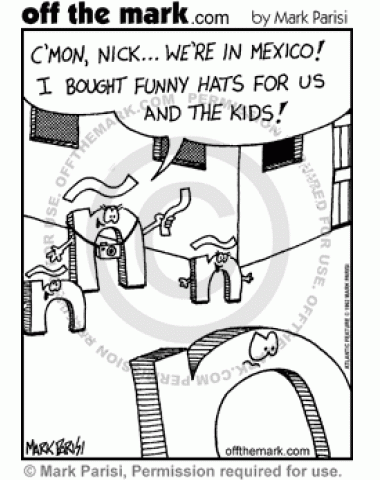 Letter N Mexican Hats Mom letter N wants husband, Nick, to participate since they are in Mexico, she bought funny hats for everyone, which are actually tilde characters.