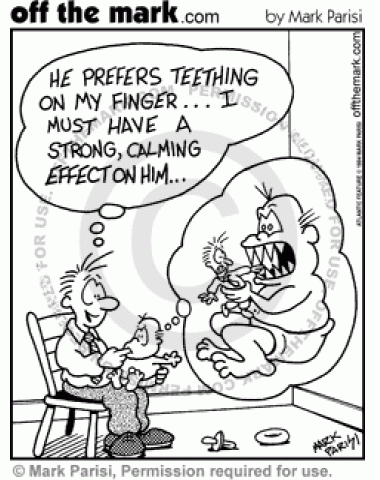 A baby prefers teething on his dad's finger because he can pretend he's a monster.
