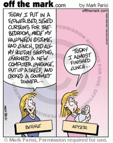 Before and After Children A woman's standards of productiveness change when she has a baby.