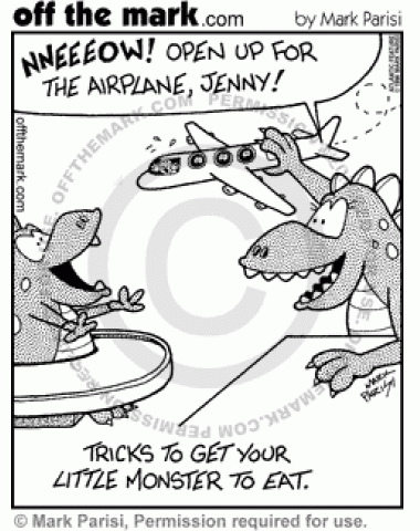 A Godzilla tells her child to open up for an airplane to trick him into eating.